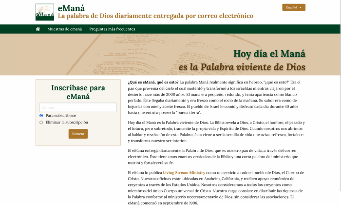 El eManá entrega diariamente la Palabra de Dios, que es nuestro pan de vida, a través del correo electrónico. Éste tiene unos cuantos versículos de la Biblia y una corta palabra del ministerio que nutrirá y fortalecerá su fe.